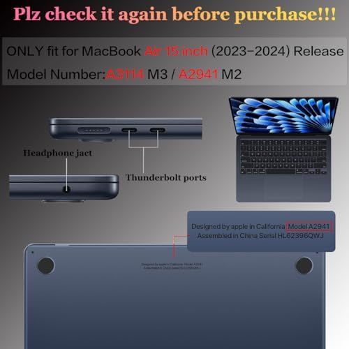 โ[Notice Model Number A2941 or A3114 ] 2023 2024 Cover for MacBook Air 15 inch – This case is ONLY compatible with MacBook Air 15 Inch Model A2941 M2 A3114 M3 Chip with Liquid Retina Display and Touch ID 2023 2024 release.