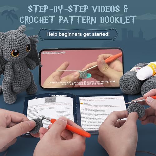 Crochetta Crochet Kit for Beginners, Amigurumi Crocheting Animals Kits w Step-by-Step Video Tutorials, Knitting Starter Pack for Adults and Kids, Jumbo Black Dragon (40%+ Yarn Content)