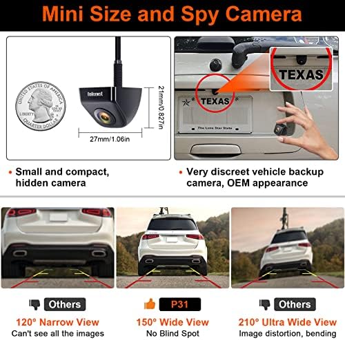 โ–บVersatile Functions: P31 rear view camera comes with multifunctional switching loops, including the ability to turn on/off the mirrored image, turn on/off guidelines, and horizontal or vertical mounting orientation. With a wide viewing angle of 150 degrees, blind spots are minimized.