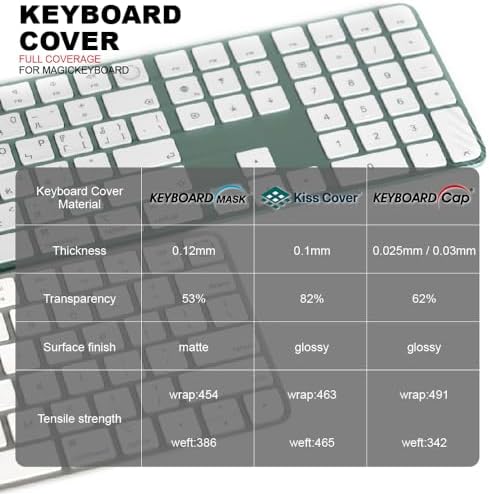 The Keyboard Cap is 5 times thinner than competing keyboard covers for the best possible sensitivity and comfort. It is an ultra-thin (0.025 mm thick) and elastic film with a smooth texture, made with high grade TPU.
