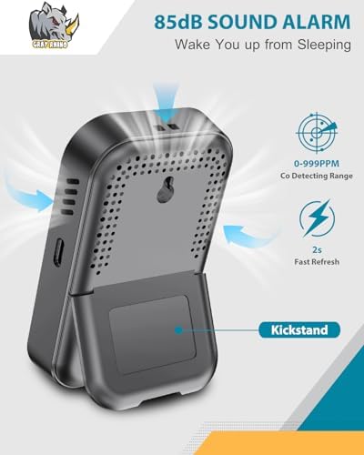 ใ2.48″ HD Multi-functional Co MonitorใGray Rhino portable co detectors build in HD 2.48″ IPS display, and high accuracy co sensor, which refreshes each 2s, to detect surrounding co value quickly, detecting range is 0-999PPM, ยฑ5PPM. At same time, it could be used as indoor thermometer, the temperature range is 14ยฐF ~ 122ยฐF,ยฑ5%. Also it could be used as hygrometer, the humidity range is 0 ~ 95%RH,ยฑ5% RH. This multifunctional carbon monoxide detector is very convenient for traveling and house.