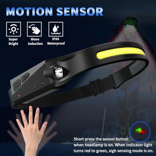HAND-FREE MOTION SENSOR: Headlamps are equipped with the latest sensitive intelligent sensors to free your hands. When the head lamps led rechargeable are on, sensor mode is turned on by pressing the sensor button, and you can turn the headlamps on/off by simply waving your hand within a 2-inch sensing range.