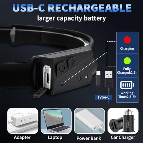 RECHARGEABLE BATTERY: The rechargeable headlamp has a built-in high-capacity lithium polymer battery, which can be used for 2.5-8 hours in different lighting modes. Equipped with Type-C USB input port, you can charge the head lamp via computer, car charger to ensure long-term use and avoid frequent charging.