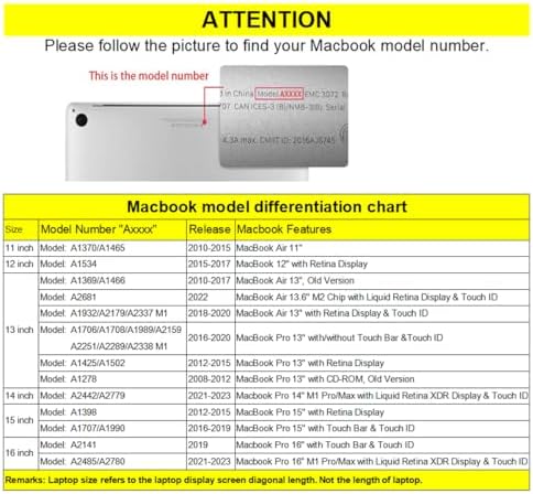 COMPATIBILITY – This case is only compatible with Model A1932/A2179/A2337(Macbook Air 13″ with retina display and touch id, Release 2018-2020). Macbook Air 13″ refers to the laptop display screen diagonal length is 13″ or 13.3″. Not the length of laptop. You can check Macbook model differentiation diagram at the picture section.
