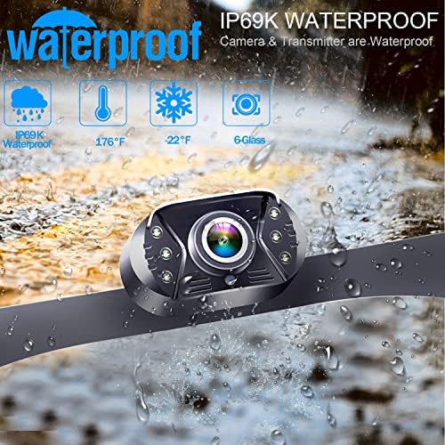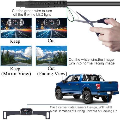 ใ€Perfect Viewing Angle & Waterproof Rateใ€‘:Adjustable reverse camera vertical view angle, showing non deformable images by 150ยฐ perfect gold viewing angle. IP69 waterproof back up camera secures your driving safety no matter what the weather like.And with 6 LED lights enhance night vision capability.