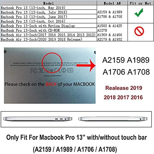 Specifically designed for MacBook Pro 13 inch 2019 2018 2017 2016 release models A2159 A1989 A1706 A1708. Not compatible with any previous MacBook Pro models. Please check the model number “A1xxx” on the back of the MacBook before purchase.