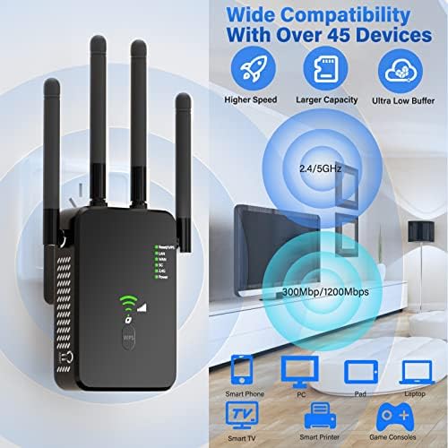 Wide Compatibility With Over 45 Devices : This signal amplifier complies with the IEEE 802.11a/b/g/n,802.11ac standard protocol and is compatible with most of wireless network devices, routers and Wi-Fi devices can easily connect to most brands of router and access point and support over 45 devices such as smartphone, PC, laptop, smart TV,online gaming and whatever standard Wi-Fi routers and Wi-Fi enabled devices.